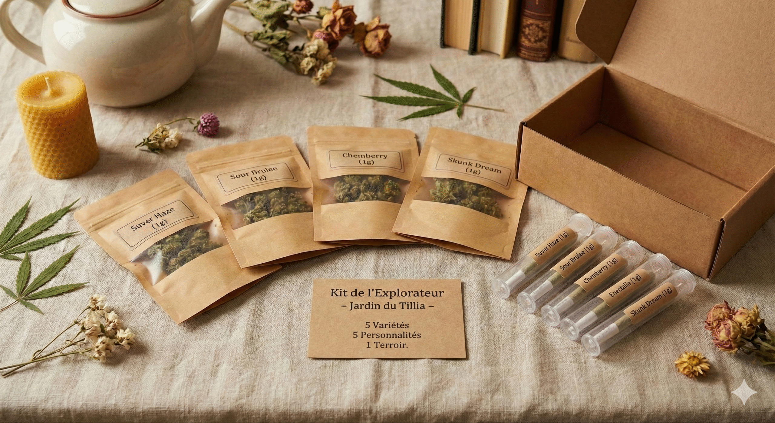 Cette année au Jardin du Tillia, nous avons cultivé la diversité. Ce coffret n’est pas une promesse de produits « dopés » ou artificiels, c’est une invitation à découvrir le chanvre tel qu’il pousse chez nous : naturel, rustique et sincère.